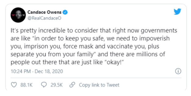 A December 18, 2020, Tweet by political commentator Candace Owens also sums up how irrational fear and panic have figuratively lobotomized a significant portion of the public: