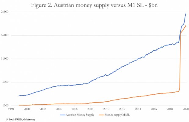 A theoretical approach to understanding money must start by defining it. This definition is taken from the glossary to von Mises’s Human Action:“The most commonly used medium of exchange in society. A community’s most marketable economic good, which people seek primarily for the purpose of later exchanging units of it for the goods or services they prefer. The circulating media most readily accepted for the payment for goods, services and outstanding debts. Money is an indispensable factor in the development of the division of labour and the resulting indirect exchanges upon which modern civilisation is based.”In other words, money is the medium that links production with consumption through the division of labour. It must be immediately available for that purpose. That certainly includes cash in circulation and money in the bank. Correctly, it is now argued by the Fed that because in practice savings are instantly available to bank depositors, that they are cash equivalents. But there are other important aspects of money, such as unspent government balances. Because that can be drawn down at any time, it is money as well, just as if it were money due to an ordinary depositor. But that is not included in the Fed’s definition of M1 (renamed M1 SL), which is an important omission given recent balances on the government’s general account of as much as $1.7 trillion. If, as well as savings deposits, unspent government balances had been included, M1 SL money supply would have looked more like Rothbard’s Austrian money supply (AMS) in Figure 2.[ii]