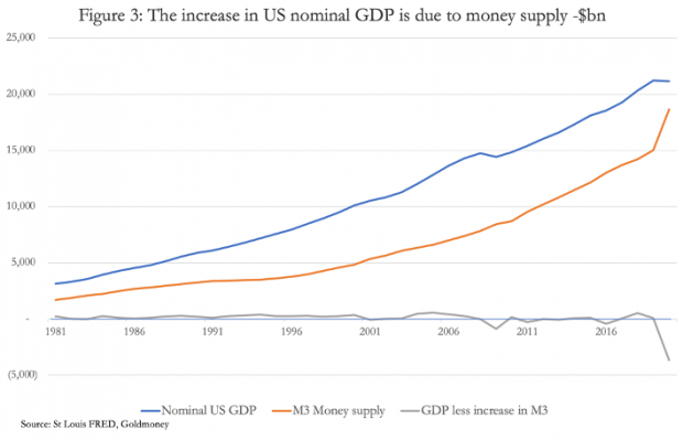 Therefore, numerical increases in an evenly rotating economy must come from the money side. In other words, if the quantity of money and credit in an economy is increased, so will GDP. And none of its increase can be attributed to an improvement in economic conditions, because it is modelled on a constantly rotating economy. This is clearly illustrated by removing monetary expansion from the GDP statistic, as illustrated in Figure 3.