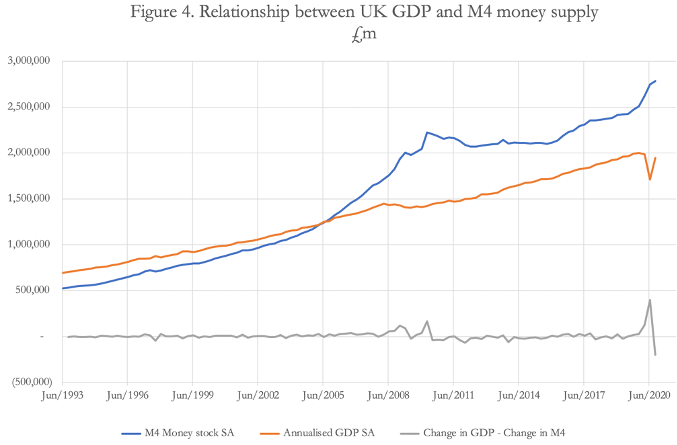 The severity of economic contraction last year was thereby concealed by the expansion of broad money. And its further expansion since the last data point (Q3 2020) will continue to mask the true depth of the economic slump. And for further confirmation, Figure 4 shows the same relationship between GDP and money supply for the UK, where similar factors are at play.