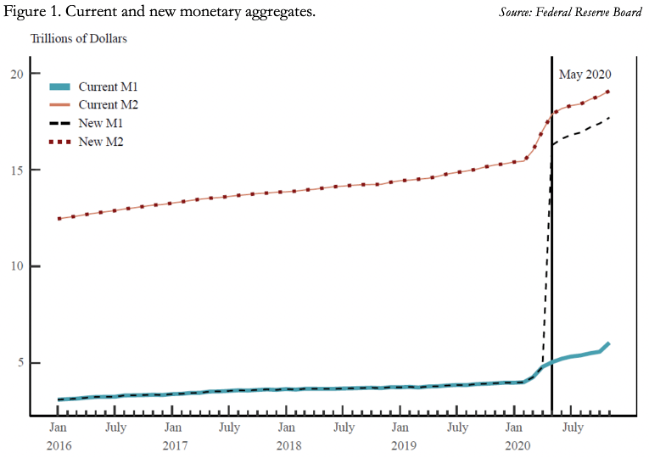 In February, the Fed changed the definition of M1 to include “Savings deposits” and “Other checkable deposits”. They are now combined and reported as “Other liquid deposits”. The effect is to increase M1 but to leave M2 unchanged, as illustrated in Figure 1.