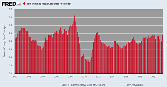 But with the 8% highest and 8% lowest prices dropped out monthly to filter out the short-run noise, the 16% trimmed mean version of the CPI at least purports to be a fixed basket price index, not a variable weight deflator like the Fed’s beloved PCE deflator.