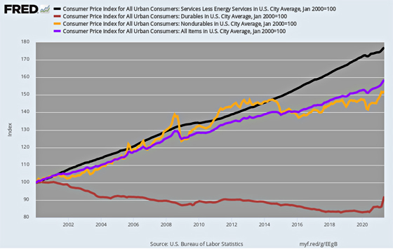 During the past 21 years, the nondurables component (yellow line) of the CPI rose by 1.99% per annum, which is as close as you please to the target, but was also on anchor on the overall CPI top-line ( purple line) which increased by 2.19% per annum.