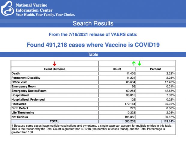 Data released today show that between Dec. 14, 2020 and July 16, 2021, a total of 491,218 total adverse events were reported to VAERS, including 11,405 deaths — an increase of 414 over the previous week. There were 48,385 serious injuries reported during the same time period — up 7,767 compared with the previous week.
