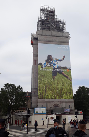 The demonstration I participated in passed the church where my daughter was baptized, St. Pierre de Montrouge in the 14th arrondissement. You can see the giant advertisement on the scaffolding in the picture below. I thought as I passed that the source of our troubles is a loss of the sacred.