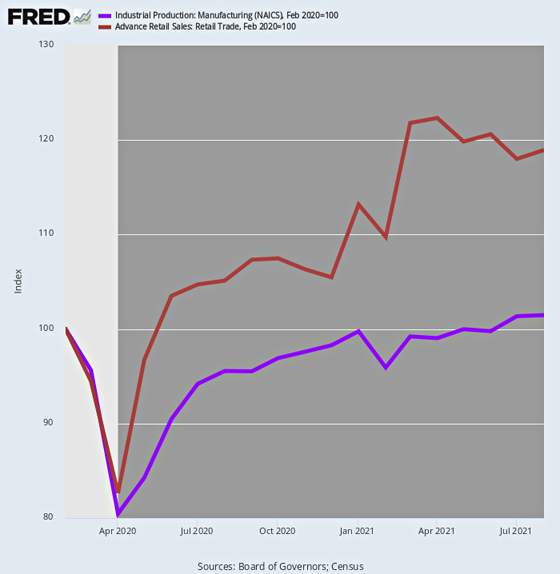 Manufacturing Production Versus Retail Sales, February 2020-August 2021