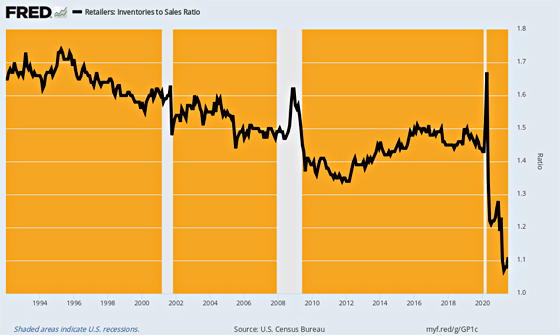 And we do mean depleted inventories. At the pre-Covid peak in February 2020 inventories were already on the light side at $655 billion, representing 1.43X sales. However, retail inventories plunged to a low of $579 billion by June 2020 and have barely recovered since then.
