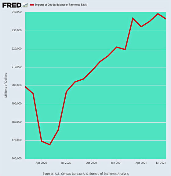As it happened, August retail sales were $547 billion or 13% higher, and cumulated to $9.00 trillion during the 18-month period. That is to say, the geniuses in Washington enabled a $900 billion increase in retail spending over and above the pre-existing trend owing to the torrent of stimmies financed by borrowing and the printing press. And on the margin, the goods came from China and other foreign suppliers.