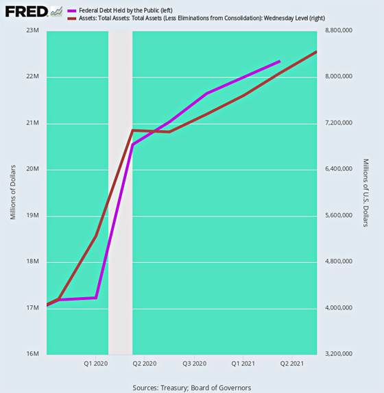 Fed Balance Sheet Versus Publicly-Held Federal Debt, Q4 2019 to Q2 2021