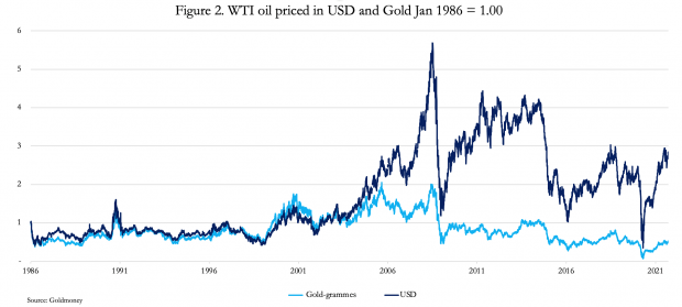 While fluctuations in the sum of the quantities of money, currency and credit affect the general level of prices, there is an additional effect of the value placed on these components by its users. History has demonstrated that the most stable value is placed on gold coin, which is what qualifies it as money. It has been said that priced in gold a Roman toga 2,000 years ago cost the same as a lounge suit today. But we don’t need to go back that far for our evidence. Figure 2 shows WTI oil priced in dollars, the world’s reserve currency, and gold both indexed to 1986. Clearly, the dollar is significantly less reliable than gold as a stable medium of exchange.