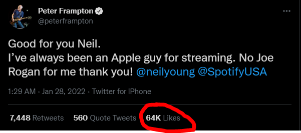 Imagine thinking because you had a few hit songs fifty years ago that you still had the power to cancel the largest podcaster in the world with over a hundred million listeners because you’re stupid enough to watch NPR and CNN and think that podcaster is disseminating “misinformation”. It takes a special level of delusion to arrive at this crossroads, willing to die on a big pharma/legacy media hill of propaganda and censorship while still believing you’re against “the man” and fighting “the system”.
