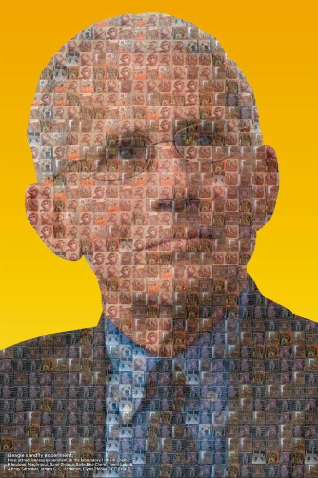 They made this mosaic out of “hundreds of tiny photographs of the monkeys and beagles he and NIAID have tormented and killed in cruel experiments.”