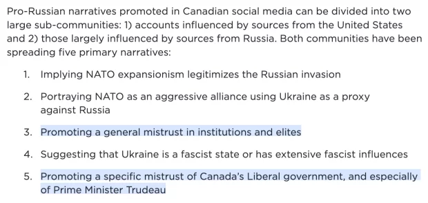 Part of Rebel News’ criticism of Boucher focused on the briefing paper’s accusation that Levant and others were spreading “pro-Russian narratives” and the briefing paper’s suggestion that “promoting a general mistrust in institutions and elites” and “promoting a specific mistrust of Canada’s Liberal government, and especially of Prime Minister Trudeau” are examples of “pro-Russian narratives.”