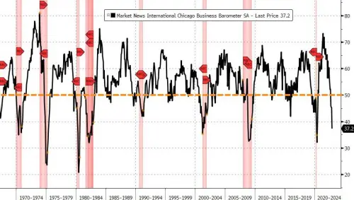 In 55 years, this level of Chicago PMI has never not failed to coincide with a recession.