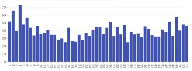 Worst consecutive 4 weeks are weeks 1-4: (52+66+40+73)/4=57.75 average per week.