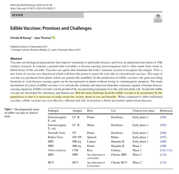 Kurup and Thomas give this additional caveat: “Growing plants for edible vaccine production requires close monitoring. The safety and quality of the genetically modified plants will be a difficult task even though manufacturing of genetically modified plants are regulated. Cross-contamination between genetically modified plants and non-genetically modified plants may occur during pollination and the genetically modified plants themselves become aggressive. Sometimes the DNA or the antigen may release into the water sources by the contact of insects or birds with the plants which causes the contamination of water bodies.”