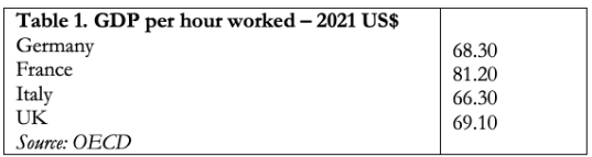 If you take OECD calculations at face value, which everyone does, you would think France would be the place to employ someone, when it turns out to be the worst. And while on the OECD’s figures there is not much to choose between productivity for the other three, in reality the differences are significant.