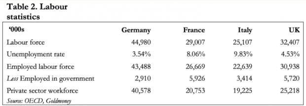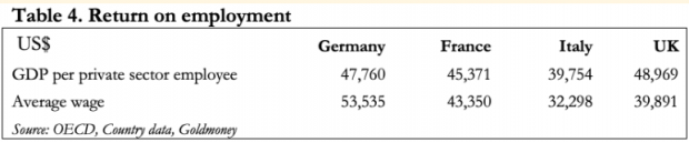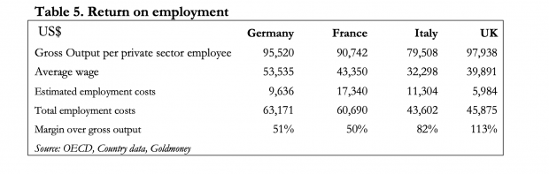 Would the average German be unprofitably employed? And would the French employ people on a marginal basis, before considering onerous employment taxes? And the slender margins in Italy and the UK for average wages suggest that while some employees are employed profitably, they are balanced by many who are not.