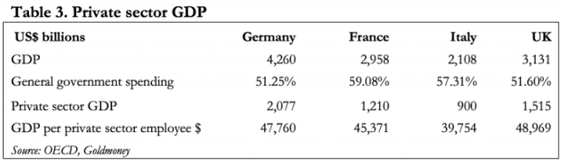 The problem is not hard to identify. GDP is comprised of final prices, the sum total of value added down the production and supply chains. It does not capture gross output values. As mentioned above, if the EU produced figures for GO, including intermediate processes for goods and services, return per employee would look more realistic. Germany, with its strong manufacturing base is probably most understated, while Italy and France with their tourist industries, perhaps less so. Britain may be somewhere in the middle., similar to GO for the US.
