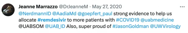 Even worse, Dr. Marrazzo bashed harmless and low cost alternatives like hydroxychloroquine, while hyping the super expensive Gilead-UAB competitor drug.