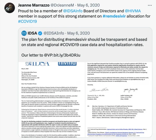 On social media, Marrazzo lavished endless praise upon Remdesivir, declaring it the best agent against coronavirus disease, and boasting that her hospital tries to use it on every covid-hospitalized patient.