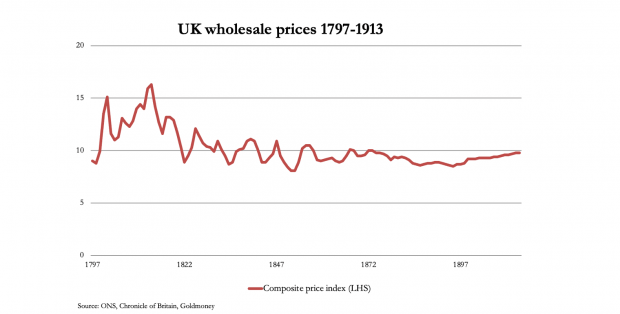 The violence of Britain’s bank credit cycle abated in the decades following the Napoleonic wars due to improvements in clearing systems, as the chart of wholesale prices below shows: