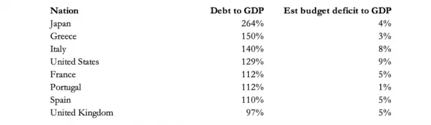 The table below shows current estimates of some debt-to-GDPs and budget deficits by the same measure.