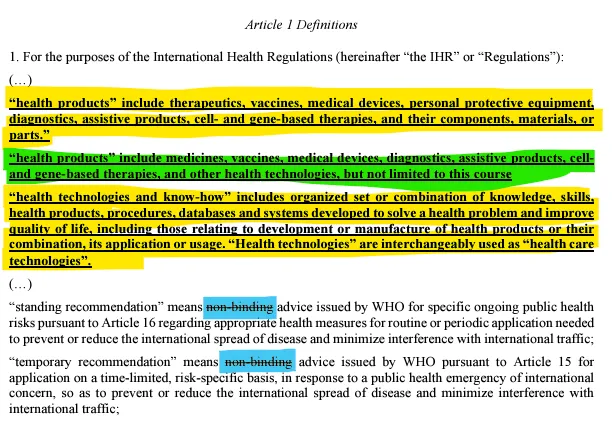 Right away, we see the poorer parties to the IHR tinkering with definitions to expand the scope of stuff they’re entitled to. Later on in their amendments, they demand wider access to things like “health products” and “health technologies and know-how,” and so they have to add language to Article 1 (“Definitions”) defining these terms as widely as possible. Bangladesh also hopes to make WHO recommendations binding, by deleting the present specification that mere recommendations are non-binding: