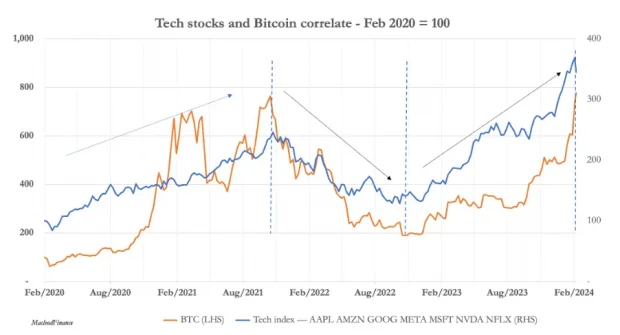 I draw your attention to the correlation between BTC and US tech stocks, illustrated in the chart below.