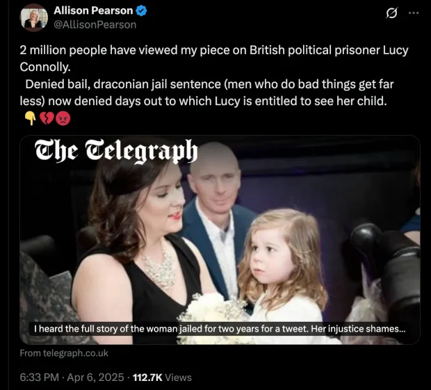 Allison Pearson of The Telegraph just wrote a piece, seen by two million people since she published it yesterday, about a British woman named Lucy Connolly, who was denied bail, and is, as Pearson posted, “jailed for two years for a tweet.”