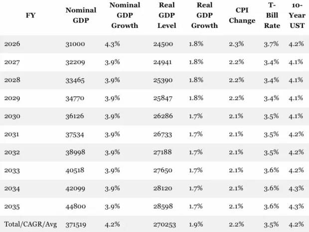 CBO Baseline Assumptions For Nominal GDP, Real GDP, Interest Rates and CPI, FY 2026-2035