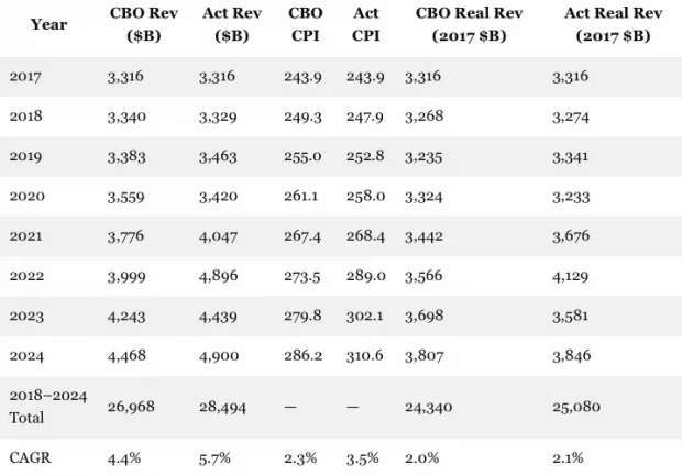 CBO 2018 Forecast Versus Actual Revenues, Growth and Inflation