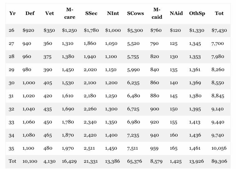 In any event, if you examine baseline spending for the first five columns in the table below—defense, the big entitlements and net interest—-which we have summed as “Sacred Cows” in the sixth column, the total off-limits budget components amount to $65.4 trillion over the next decade. That’s fully 73% projected baseline spending of $89.3 trillion during the next 10 years.
