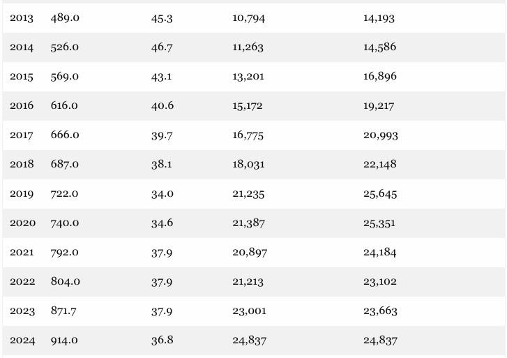 As shown above, total medicaid spending has increased by 340% since the year 2ooo— from $207 billion per year to $914 billion in 2024. However, during the same 24-year interval the poverty population grew by only 16%, rising from 31.6 million at the turn of the century to 36.8 million in 2024.