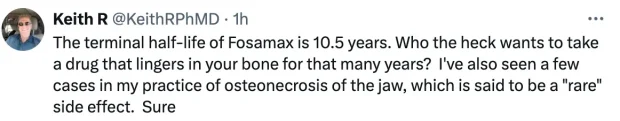 Note: a variety of other newer drugs exist to treat osteoporosis. These drugs are often more effective at producing stronger bones, and often don’t have the same significant side effects seen with the bisphosphonates, so quite a few of my colleagues use them. Unfortunately, those drugs tend to be much more expensive and each one still has its own set of side effects.