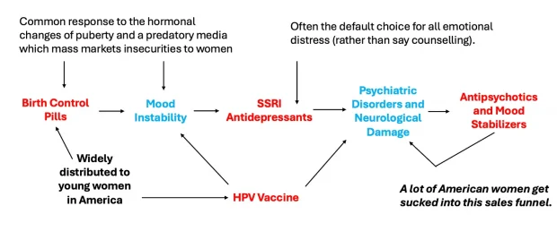 The first works by normalizing giving an “innocuous” drug to broad swathes of people and then selling increasingly expensive pharmaceutical drugs to treat the complications many experience from those drugs. One of the most insidious ones affects many of our girls and is one I’ve repeatedly tried to draw attention to:
