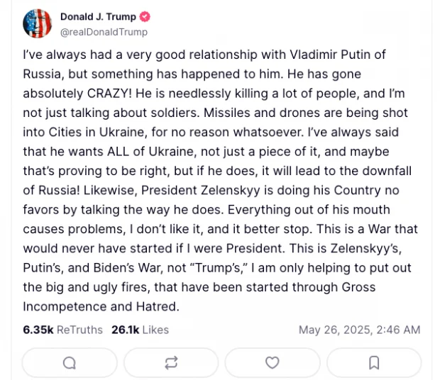 To address this issue, Donald Trump must give the Ukrainians something in return. He chose to question the savagery Russia displays when it is certain it is right, which it is. The Western press chose to focus only on the passage where the US president wonders if Vladimir Putin has gone mad. But in the same post, he also denounced Volodymyr Zelensky’s speech. He thus equated the Russian president’s cruelty with the Ukrainian leader’s bad faith. It is important to realize that while emotionally he gives the Ukrainians the upper hand, politically he gives it to the Russians.