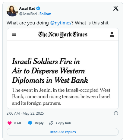 This was a story which provoked outcry and condemnation throughout the western world, but look at the lengths the New York Times editor went to in order to frame the IDF’s actions in the most innocent way possible. They were firing into the air. They were firing “to disperse western diplomats”—like that’s a thing. Like diplomats are crows on a cornfield or something. Oh yeah, ya know ya get too many diplomats flockin’ around and ya gotta fire a few rounds to disperse ’em. Just normal stuff.