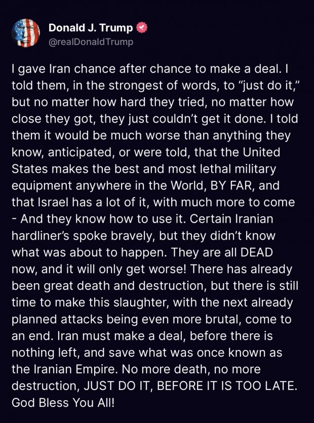 Just days ago, Donald Trump said to reporters that he had told Benjamin Netanyahu that military intervention “would be inappropriate to do right now because we’re very close to a solution. Now, that could change at any moment. It could change with a phone call. But right now, I think they want to make a deal. And, if we can make a deal, [it would] save a lot of lives.”