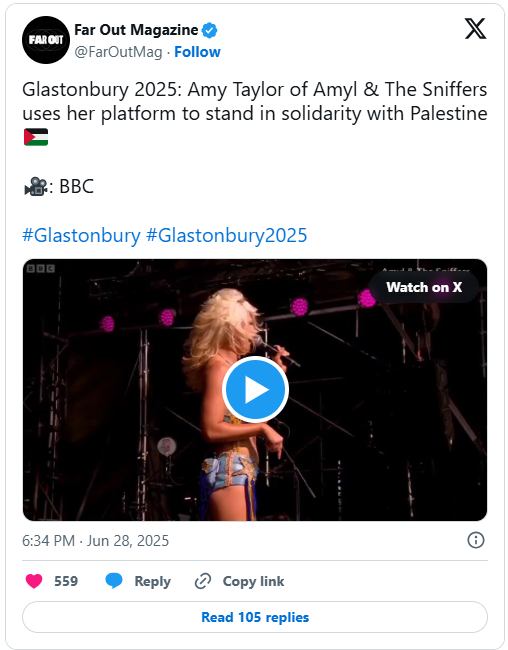 One of my favorite clips from the Glastonbury Festival came from Australian band Amyl and the Sniffers, whose vocalist Amy Taylor gave an off-the-cuff speech about Palestine and colonialism and the parallels between what white colonizers did to Indigenous Australians and what’s happening to the Palestinians today.