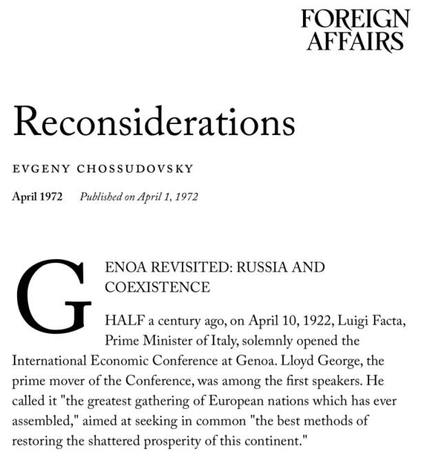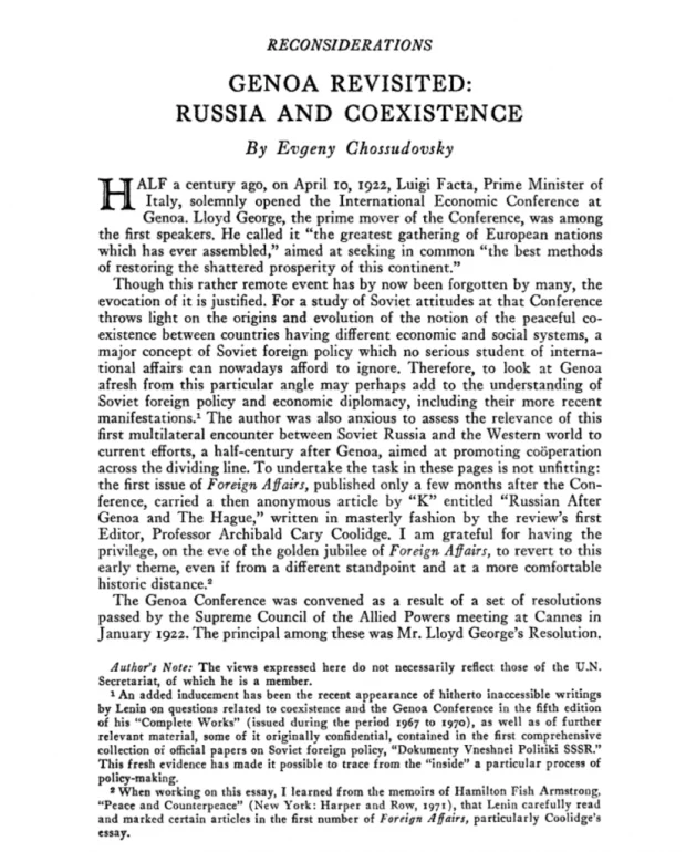 The article below entitled Genoa Revisted: Russia and Coexistence was written by my late father Evgeny Chossudovsky in April 1972 (in commemoration of the Genoa 1922 Conference). It was published by Foreign Affairs.