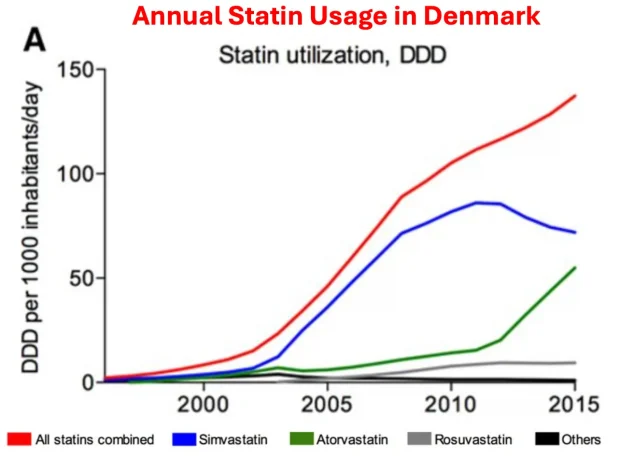 As you would expect, similar increases also occurred within the USA. For example, in 2008-2009, 12% of Americans over 40 reported taking a statin, whereas in 2018-2019, that had increased to 35% of Americans.