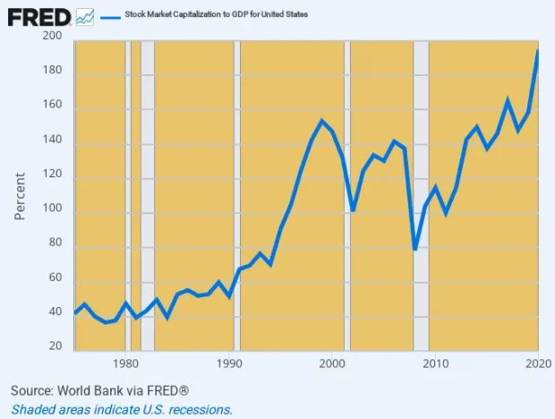 US Stock Market Capitalization As a % of GDP, 1970 to 2022