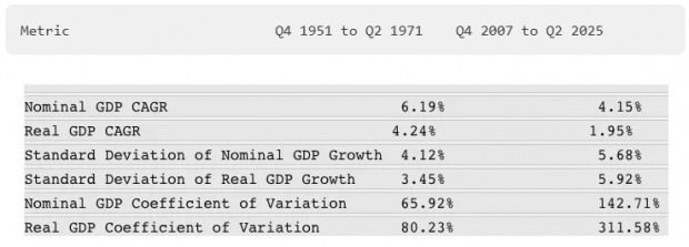 The latter tells you everything you need to know. Given that the mean growth trend was sharply lower over Q4 2007 to Q2 2025 while the standard deviation was much higher, you got a compounding effect in this bottom line metric. To wit, the coefficient of variation with respect to nominal GDP during the last 18 years was more than double its level during the Martin Era, while the coefficient of variation since 2007 with respect to real GDP was triple that which prevailed during the 1950s and 1960s.
