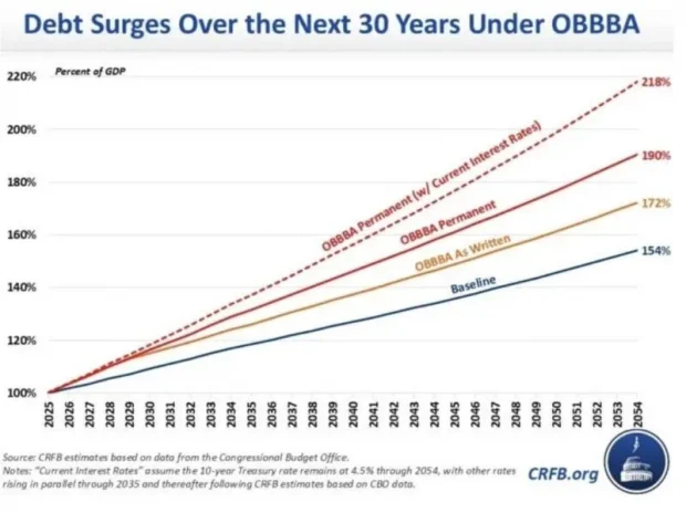 Nevertheless, the above chart is only a warm-up. The real disaster coming down the pike is owing to the fact that three months ago the Trumpified GOP enacted the MOABB (mother of all budget busters) aka the One Big Beautiful Bill Act or OBBBA. It will result in a cool $155 trillion being added to the public debt by mid-century.
