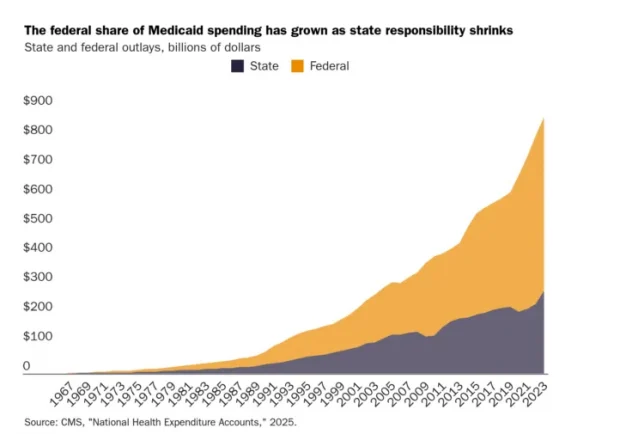 That’s right. At the present time states raise upwards of $45 billion per year from so-called “provider taxes”, which providers, in turn, get the $45 billion back as reimbursements for their “cost” of service. While there have been various Federal efforts to block such scams, the current 6% cap on provider taxes as a share of patient revenues tells you all you need to know. State fiscal authorities have been on a path toward round-tripping their entire share of Medicaid costs to Washington, but the modest tightening of the cap (to 3.5% of provider revenues) contained in the OBBBA is apparently more than the Senate Dems can live with.