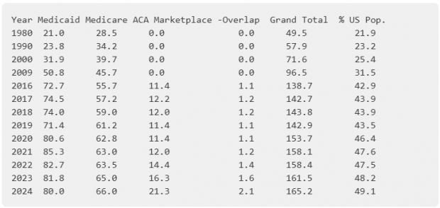 As shown in the tables below, enrollment in Federal medical insurance programs stood 49.5 million and 21.0% of the population in 1980, when Ronald Reagan came to town vowing to shrink the Welfare State, including the encroachments of socialized medical care. Alas, the Gipper and his heirs and assigns on the GOP side of the aisle whiffed, allowing the UniParty to push expansions that have now taken Federal medical insurance coverage to 165 million or damn near 50% of the US population