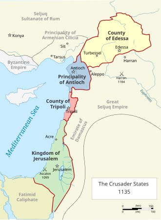 “The Crusader states, or Outremer, were four Christian states established in the Levant region and southeastern Anatolia from 1098 to 1291. Following the principles of feudalism, the foundation for these polities was laid by the First Crusade, which was proclaimed by the Latin Church in 1095 in order to reclaim the Holy Land after it was lost to the 7th-century Muslim conquest. From north to south, they were: the County of Edessa (1098–1150), the Principality of Antioch (1098–1268), the County of Tripoli (1102–1289), and the Kingdom of Jerusalem (1099–1291).”
