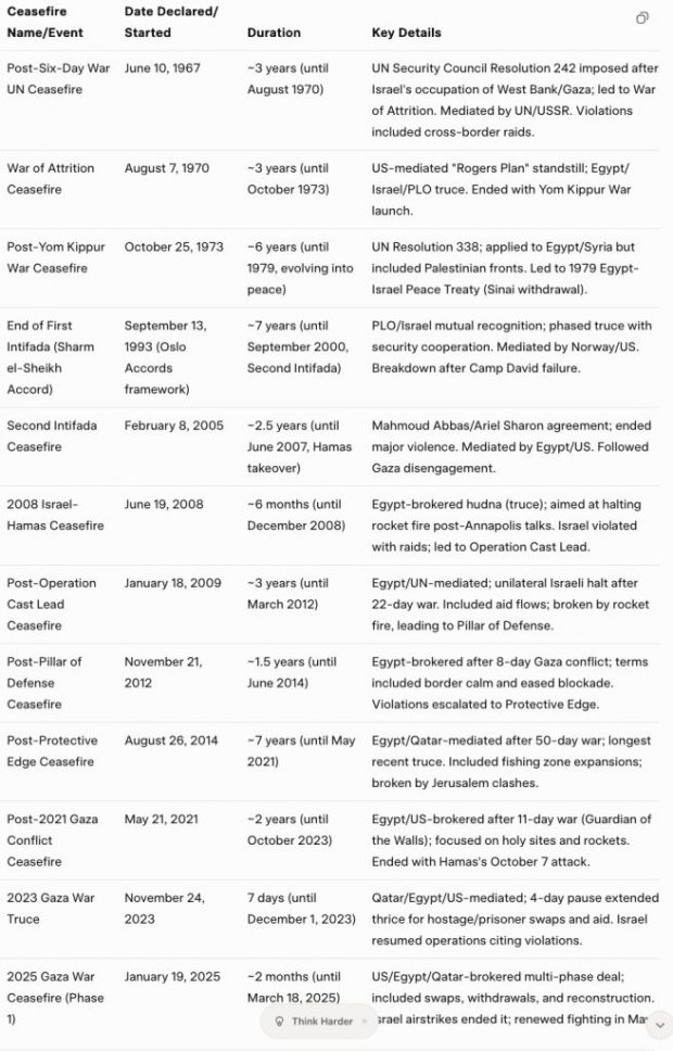 Judging from history, there is no chance that this agreement produces the peace that Donald Trump envisions. Since the 1967 Six-Day War, the Israeli-Palestinian conflict has seen numerous ceasefires (also called truces, hudnas, or armistices), primarily involving Israel and Palestinian groups like the PLO, Fatah, Hamas, and Palestinian Islamic Jihad (PIJ). These are often mediated by the UN, Egypt, Qatar, or the US and tend to follow escalations such as wars, intifadas, or Gaza operations. “Declaration” typically refers to formal agreements between the parties, though some are unilateral or UN-imposed.