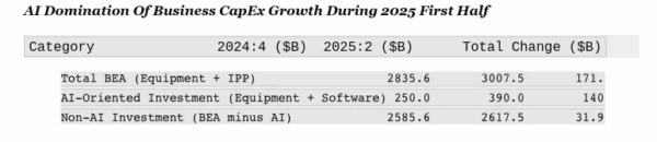 Of course, when you back out this AI investment explosion from the overall US investment spending numbers, what’s left is pretty punk. To wit, non-AI investment in US equipment and intellectual property in the fourth quarter of 2024 totaled $2.586 trillion, which figure rose by only $31.9 billion as of Q2 2025. So the annualized rate of gain was just 2.4% during the 2025 first half—a level far below the 12.2% annual gain in the AI-swollen BEA figure for total US equipment and intellectual property (first line) investment.